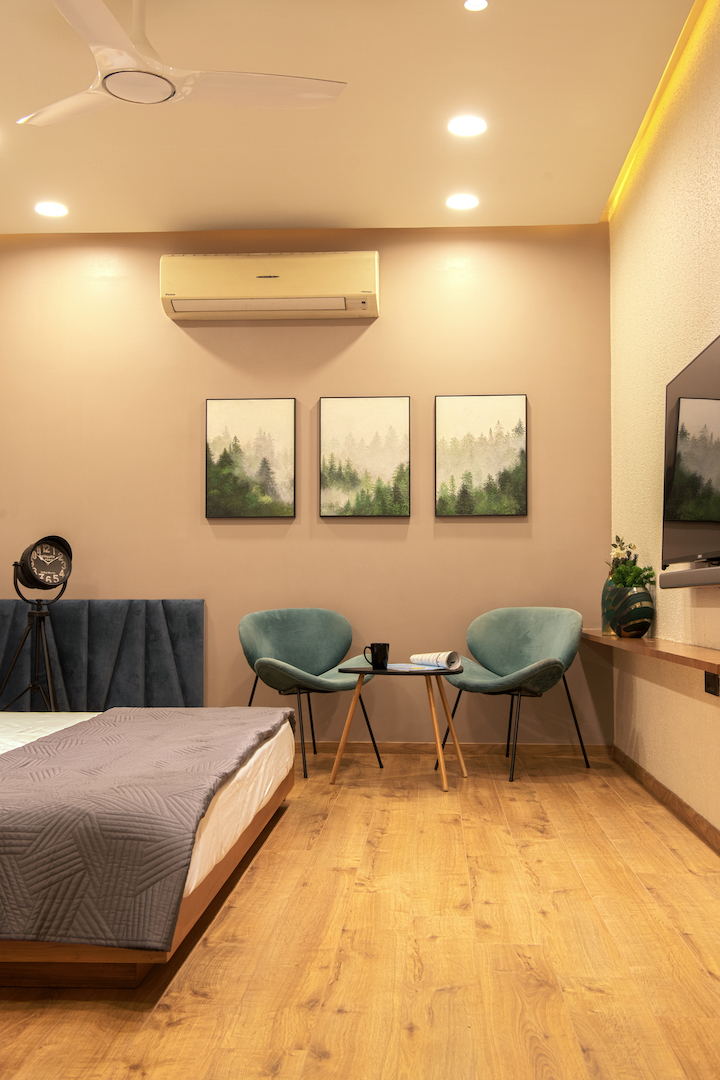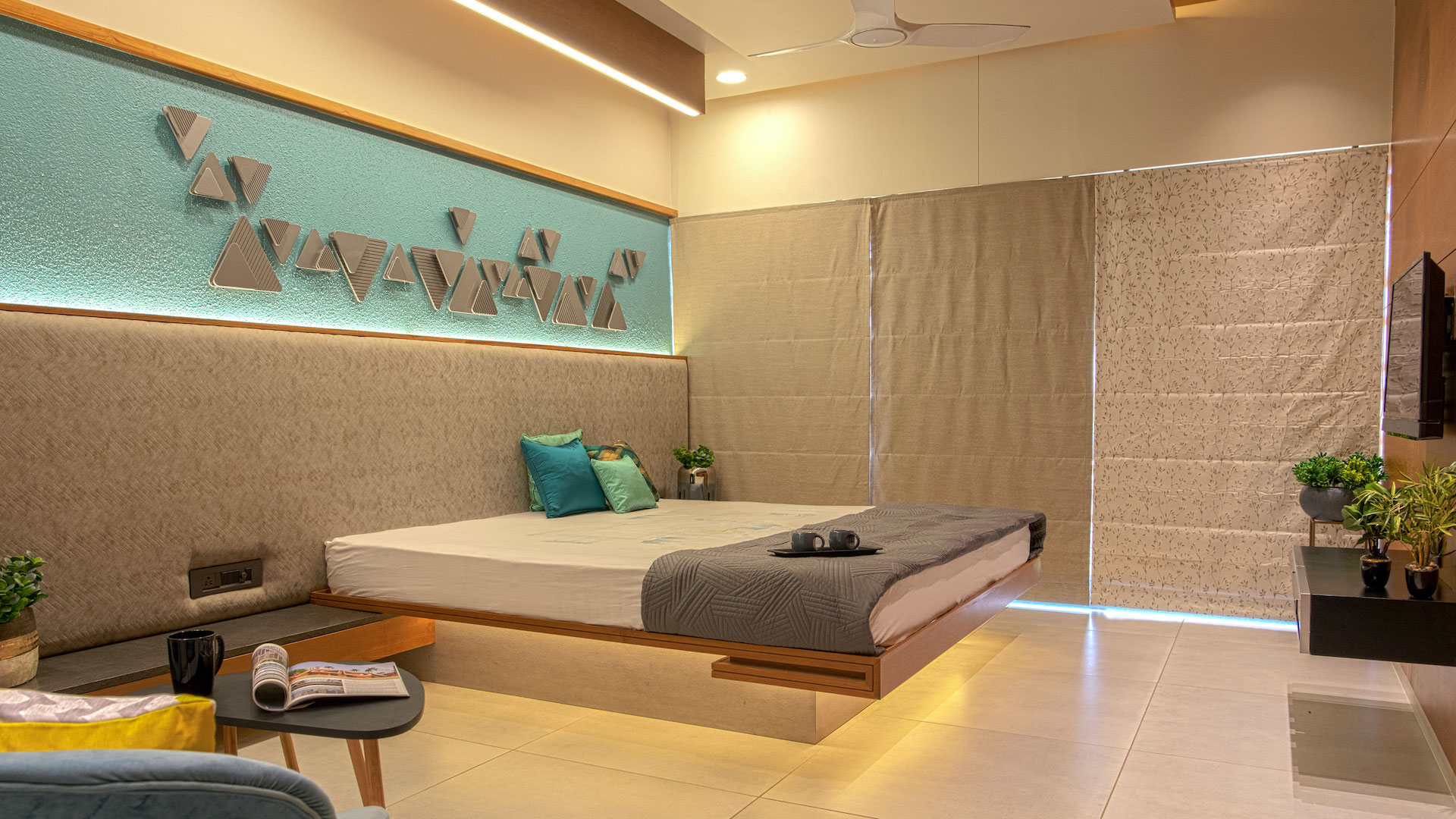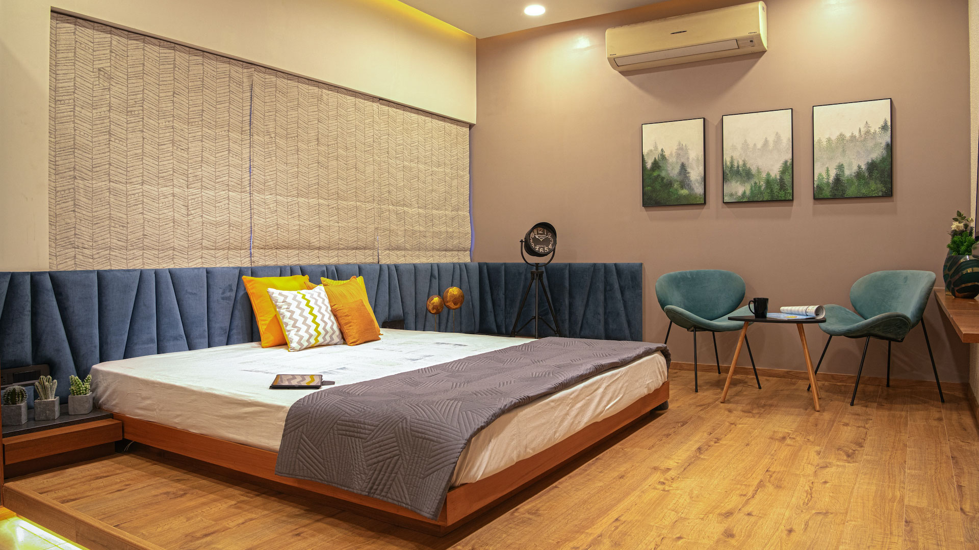 The master bedroom reflects understated luxury and contemporary charm. A work desk and informal lounging area coexist with a geometric wooden back panel and elevated deck, offering a multifunctional yet serene retreat.