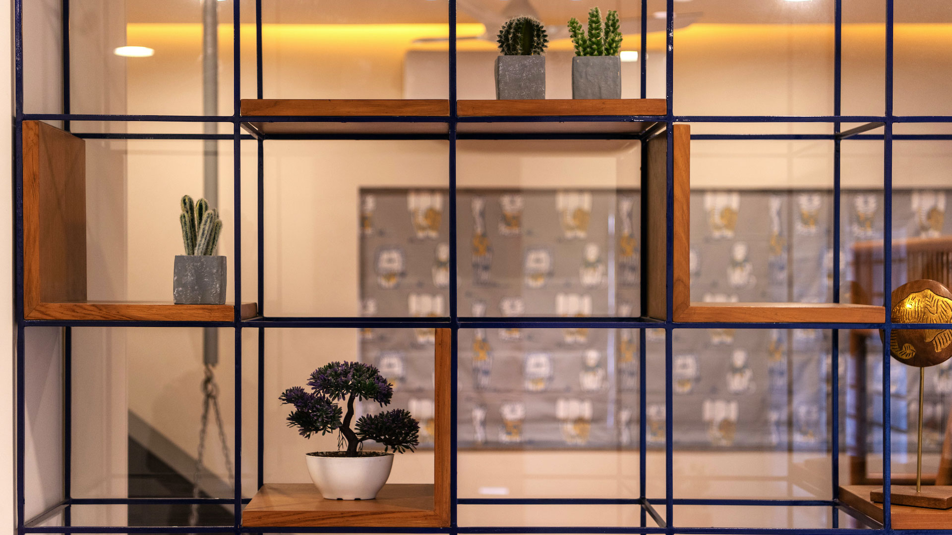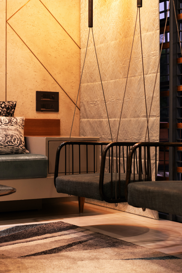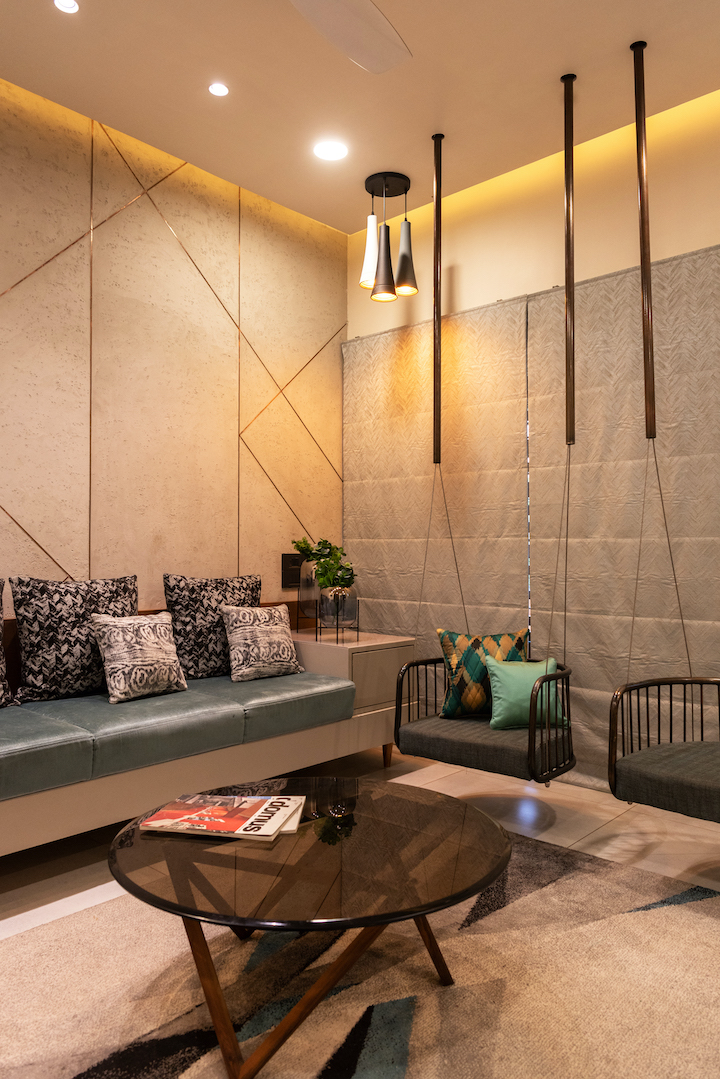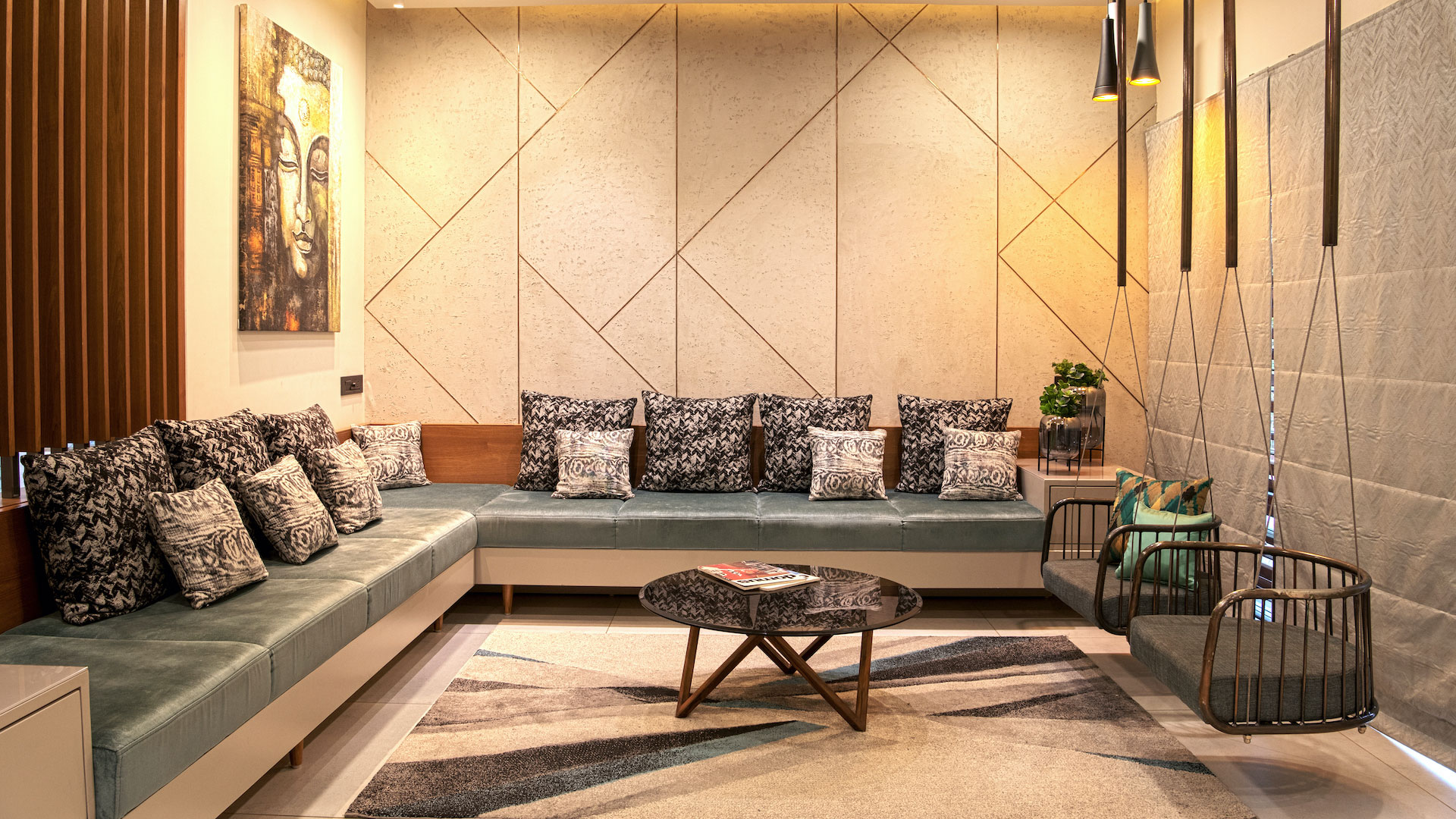 Personalized design elements bring individual identity to every corner. The spatial sequence—vestibule, living, dining, puja, and kitchen—has been consciously skewed to align with the clients’ lifestyle. The foyer sets the tone with a cement-textured base complemented by warm wood, a Lord Ganesha idol, and curated art pieces, enriching the welcoming ambience.