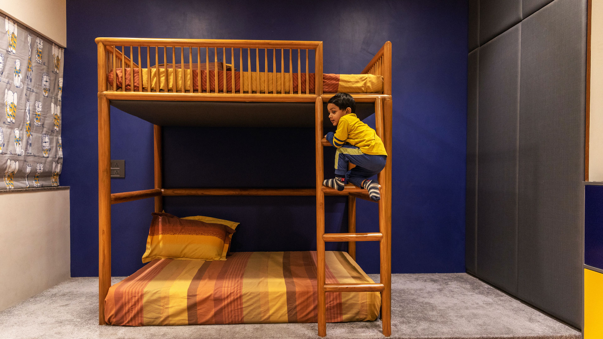 The kids' room prioritizes safety, supervision, and imagination. A partition of wooden panels within a metal frame defines spaces while allowing visibility. A vibrant blue wall, bunk bed, and deck promote playfulness. Details like dice-pattern cabinets, a chalkboard-green surface, basketball drawer knobs, and an integrated slide nurture creativity and fun, further accentuated by a playful swing.