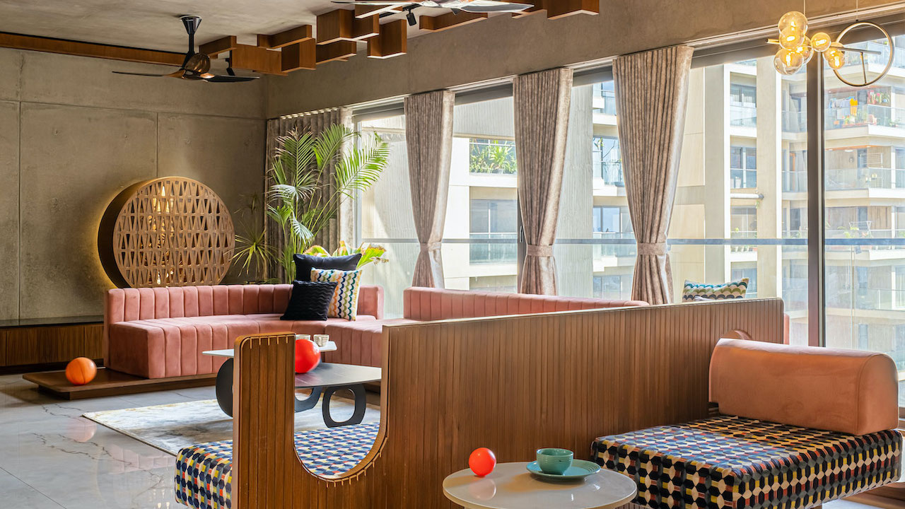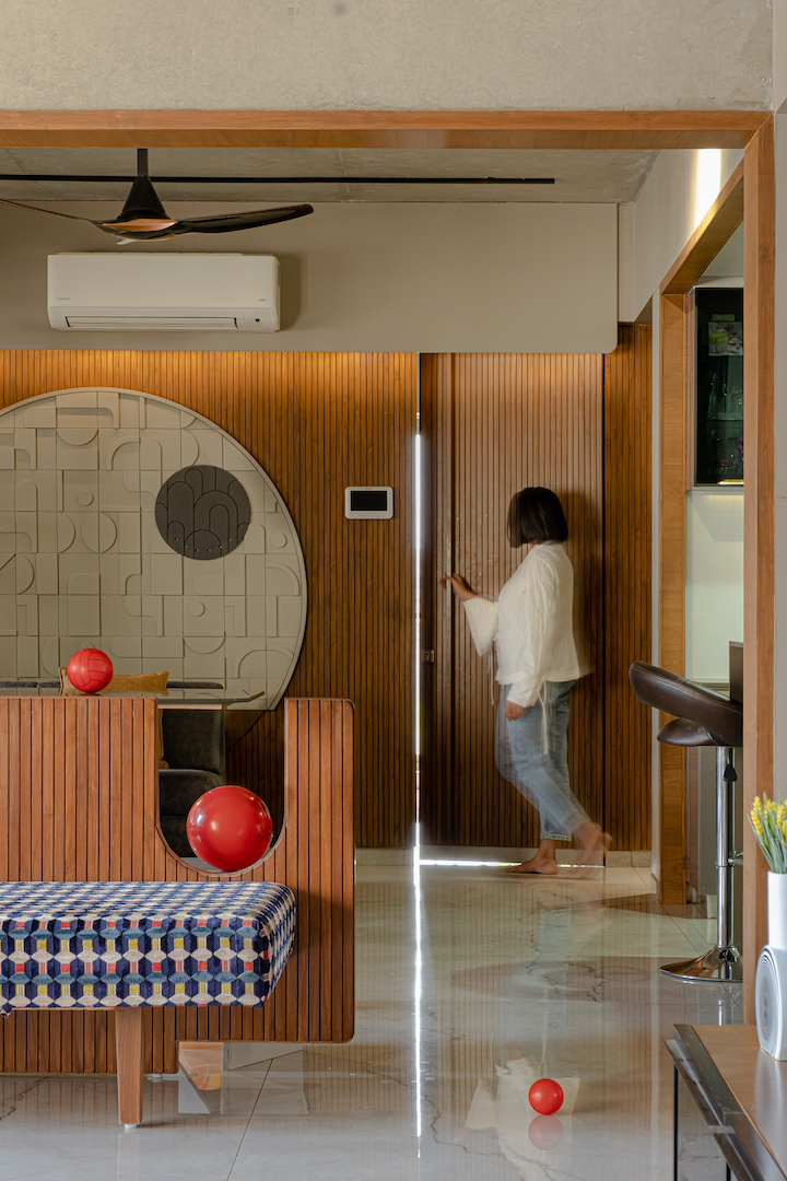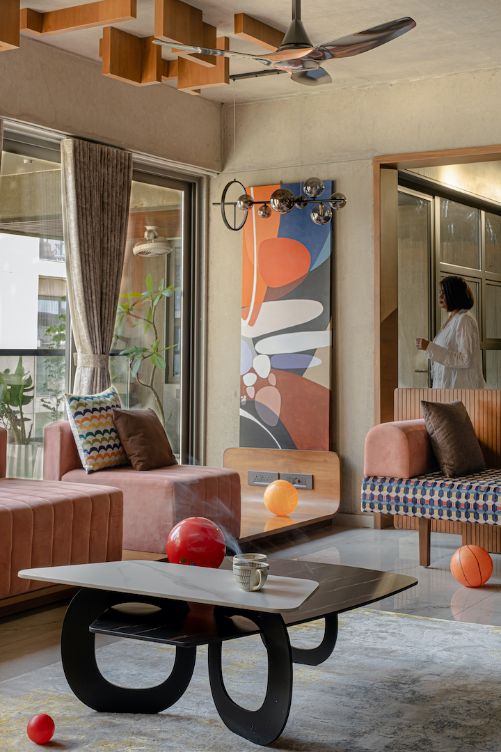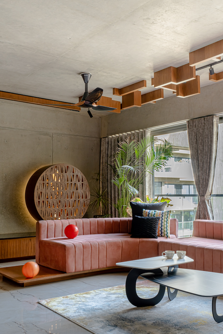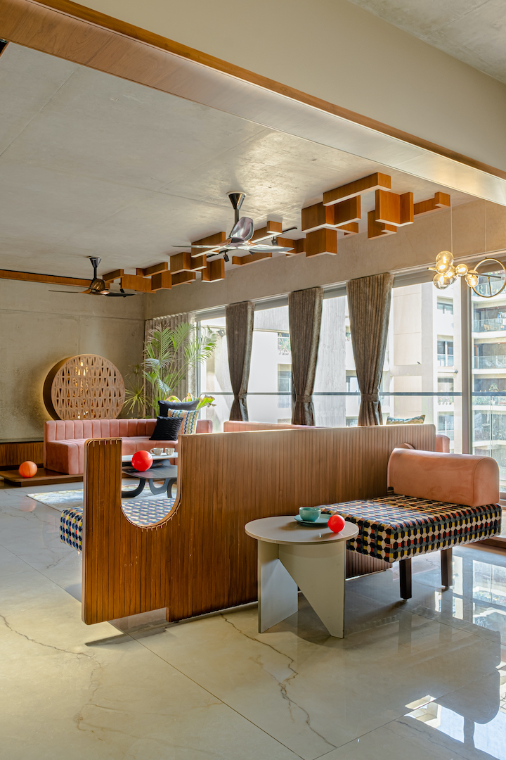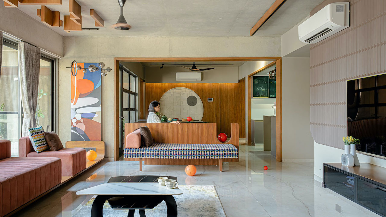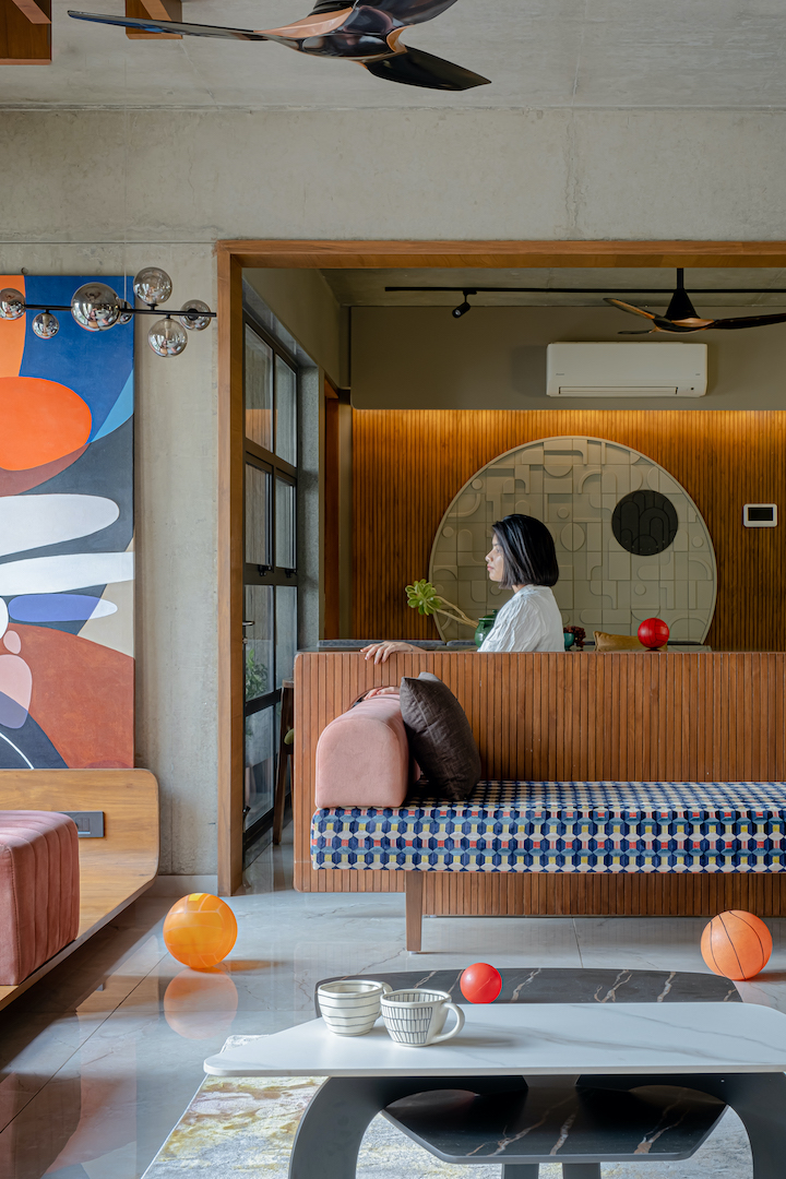 The living area and dining area sets a thin line of functionality. Also, the backdrop in the dining area seems to be a continuous partition, designed to merge the bedroom door to have the dining area's continuity. With the subtleness, the play of color in the furniture and the monochrome art adds to the ambiance, balancing the subtleness. contrasting color palette of peach and blue with walnut and a sleek range of wooden and metallic textures, transform this brutalist premises into a punchy environment of simple playfulness. “Platforms with varying heights are designed to create the playfulness in the spaces”, said the designers. Altogether, the design follows a minimalistic as well as a seek approach.