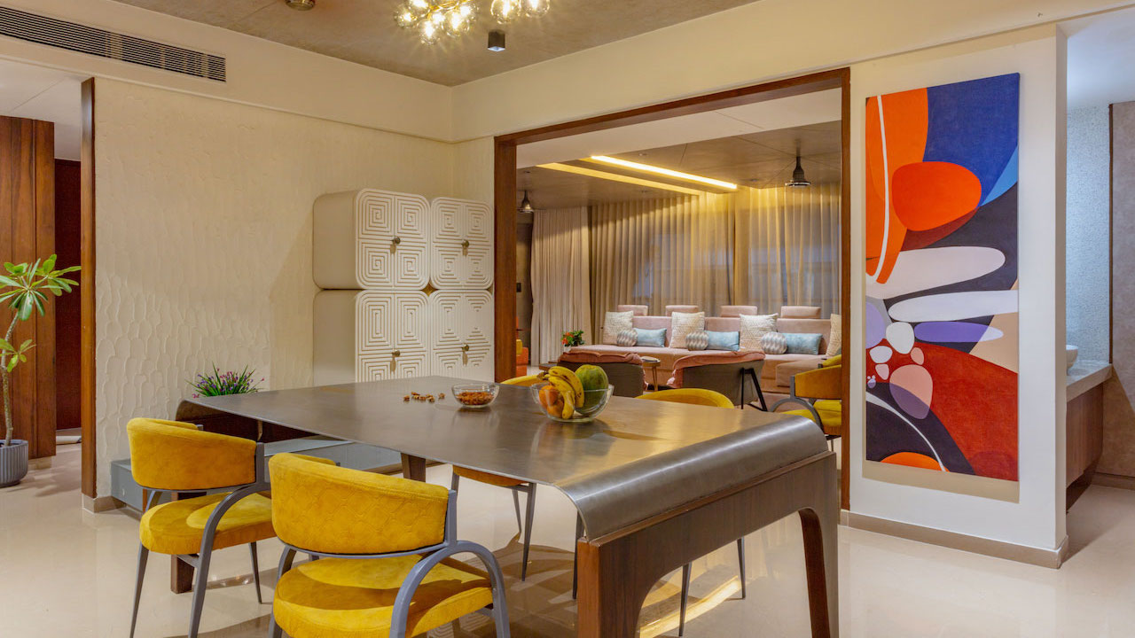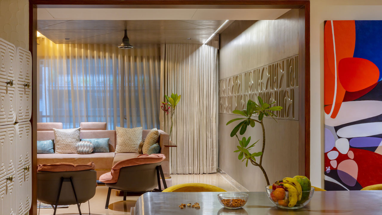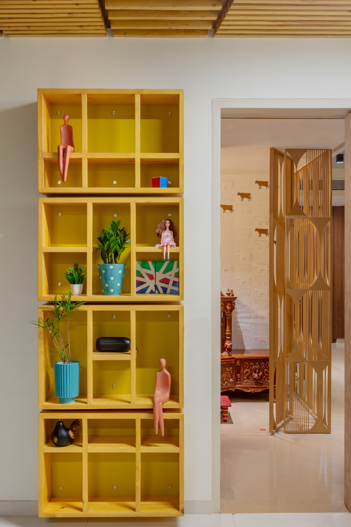 Upon entering the apartment, visitors are greeted by a stunning mural of the God Shriniathji. This mural reflects the family's strong faith in religion and creates a welcoming and homely atmosphere.