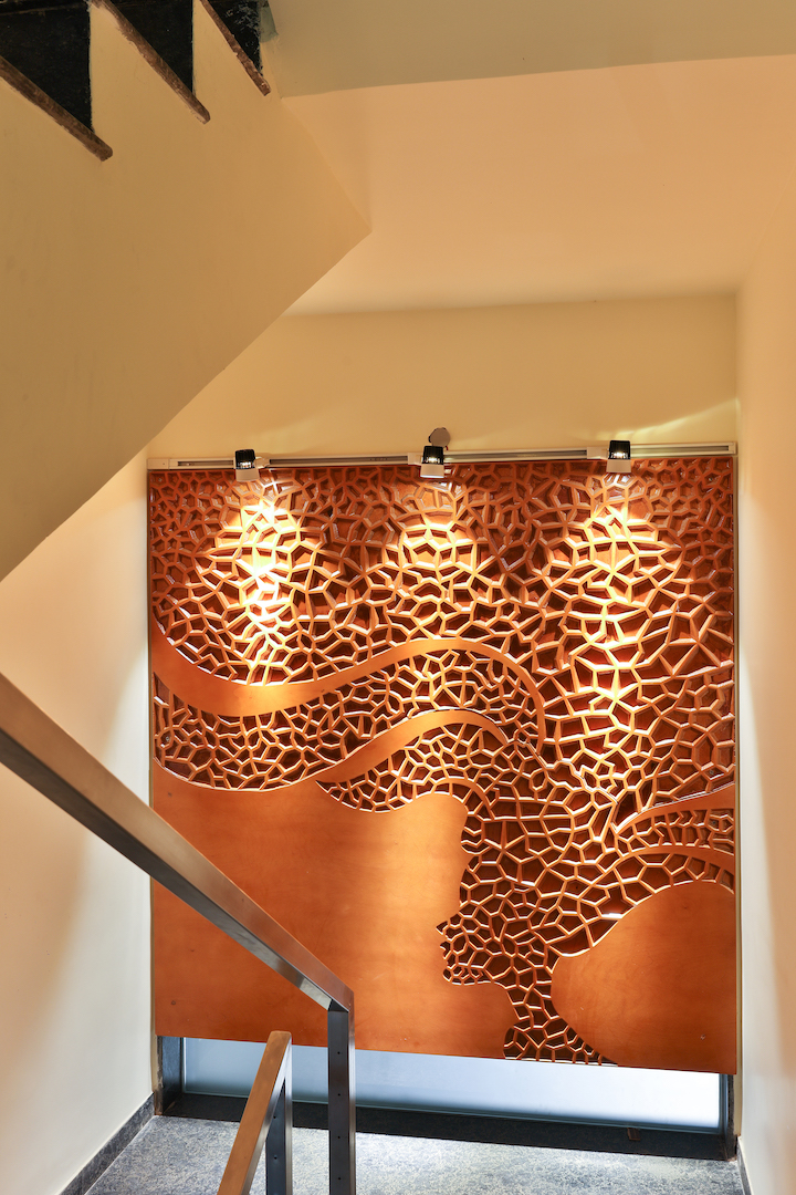 The facade being developed in a unique way from all the sides gives open space to the building and it doesn’t seem congested even on the inside. As the back side faces east, it is kept open for fresh air ventilation, the west side is rather subjected to natural sunlight which causes absorption of heat, but it is treated with the fabrication of metal net and a large scale louvered screen which lets daylight in and obstructs heat. These window slits are made out of rainfall effect slate stones which enhances the looks of the facade.