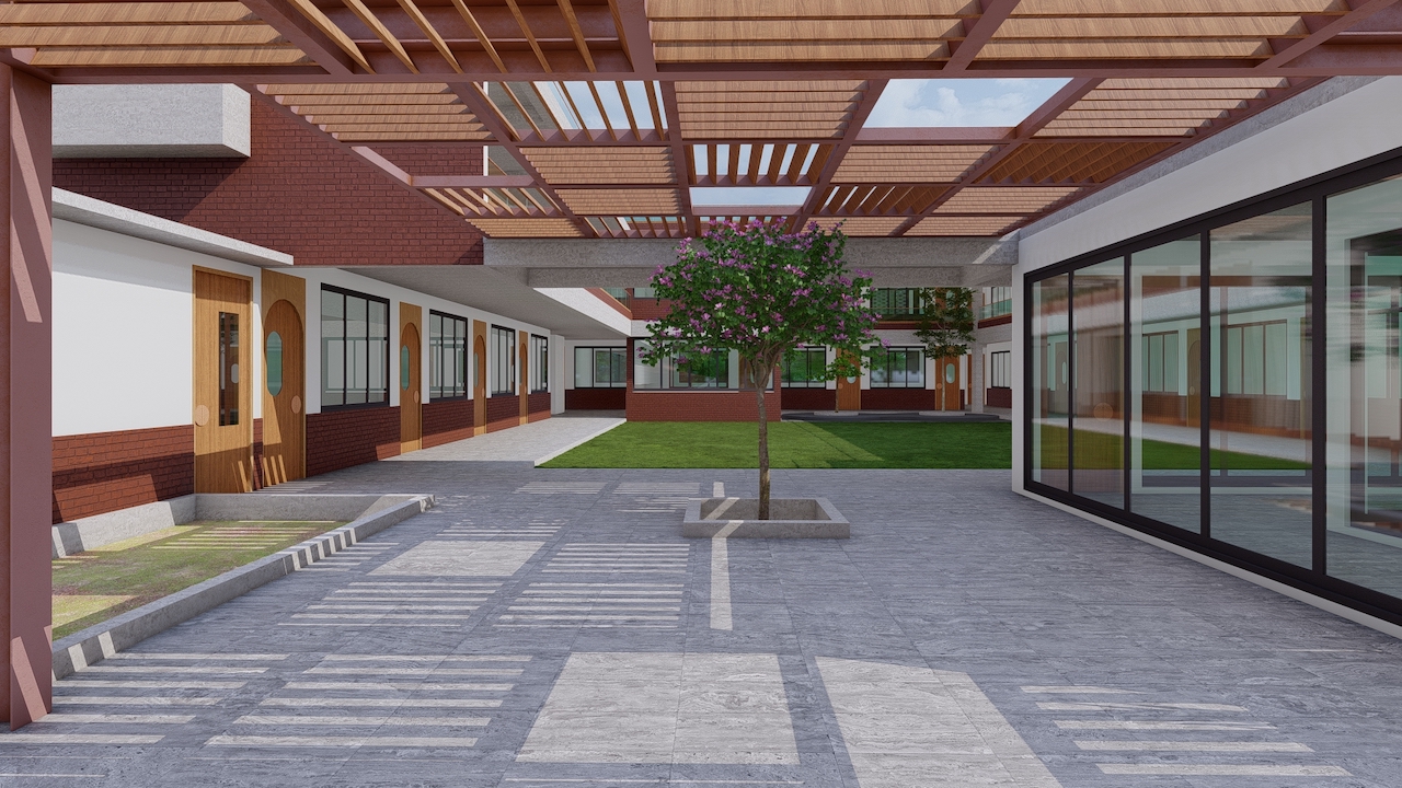 In addition, the preschool's design was heavily influenced by the client's desire for exposed brickwork and RCC finishes, as well as a strong focus on technology-driven smart classes. The final plan takes the form of a C-shaped module with a central garden space that serves multiple purposes, such as group prayers and assemblies.