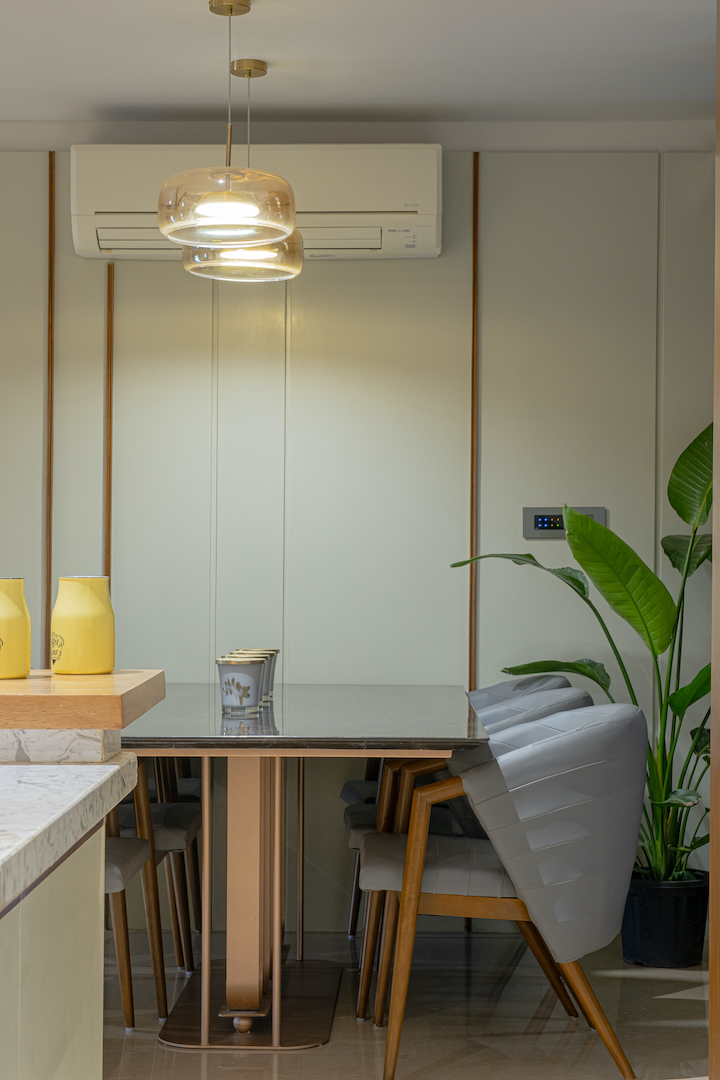 In the dining area, we created a custom-made oval table with metal legs and an Italian table top in a dark color, contrasting with the white PU walls around it. The paneling was done to create a seamless wall surface with uplit LED lighting, merging all bedroom doors and creating a more dramatic space to perceive.