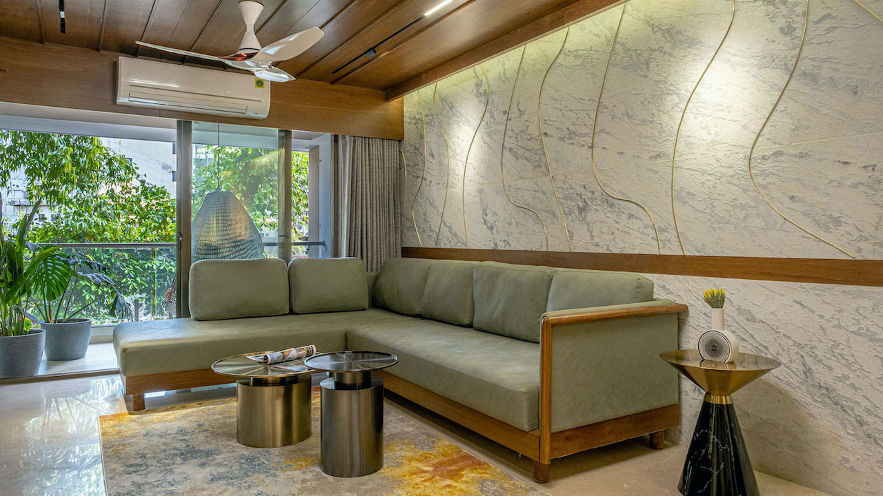 Moving into the drawing room, we opted for a minimal approach with a simple wooden door with carving, rust orange accent chairs, and patti detailing on the walls. The living space features a striking TV unit with cut-out details on black matt glass and an Italian textured stone cladding sofa with brass inlay, creating a stunning feature wall. The wooden ceiling with linear lighting and modern chandelier perfectly complemented the overall aesthetic. A carved stone mural on a side wall became a focal point and defined the luxurious choice of interior design.