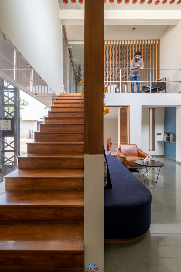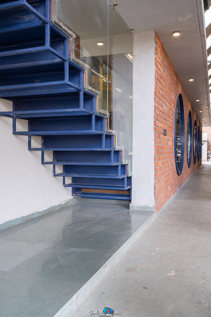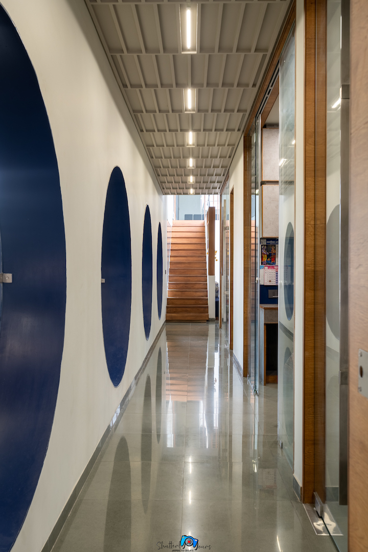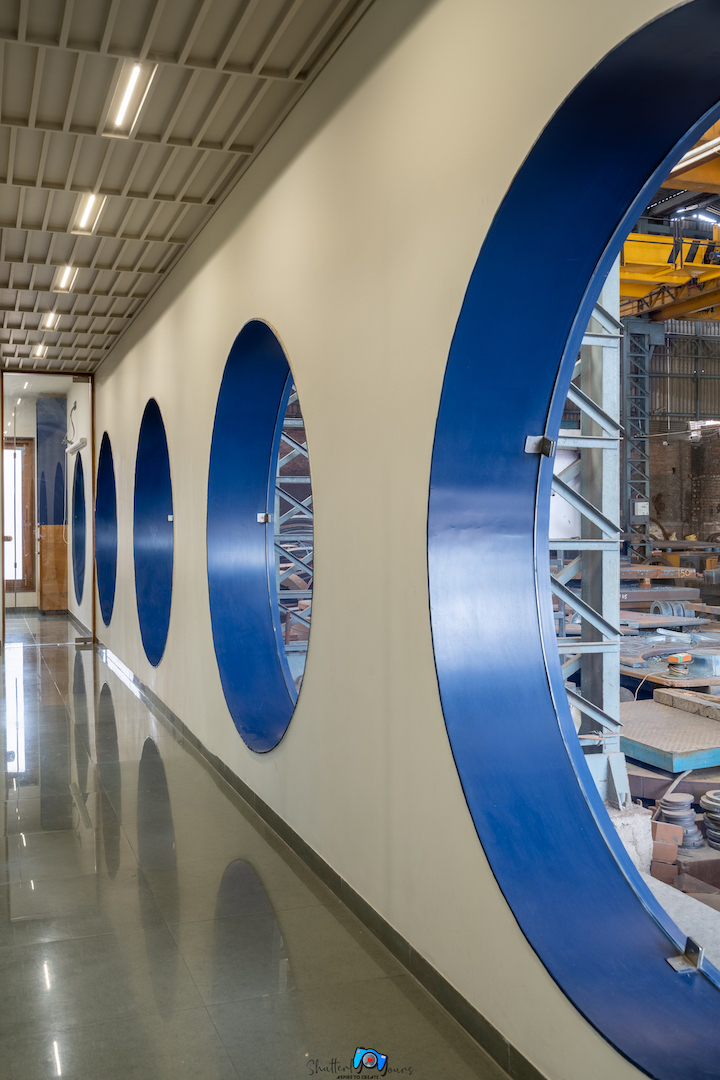 The lobby through lounge leads to office department and the other side has circular punchers enabling view to the workshop. The punctures are highlighted through blue paint. The view of lobby with office’s entrance on side and parallel running punctures on the other, with focal point of the staircase is subtle and elegant.