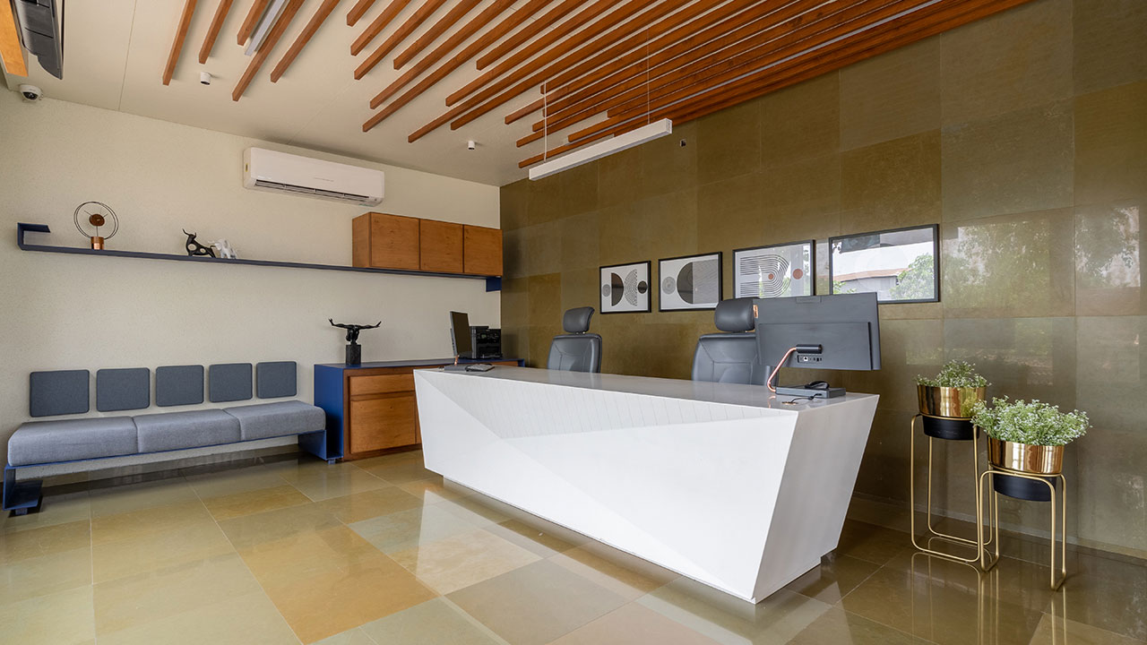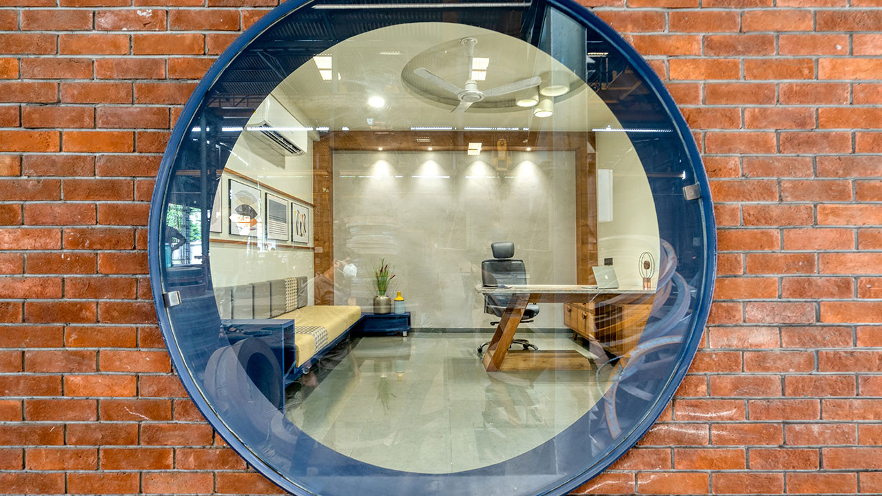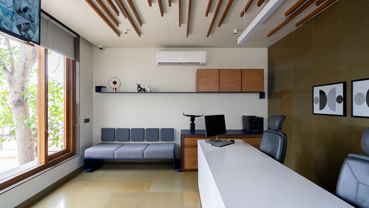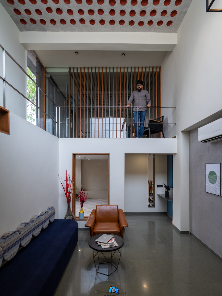 The lobby through lounge leads to office department and the other side has circular punchers enabling view to the workshop. The punctures are highlighted through blue paint. The view of lobby with office’s entrance on side and parallel running punctures on the other, with focal point of the staircase is subtle and elegant.