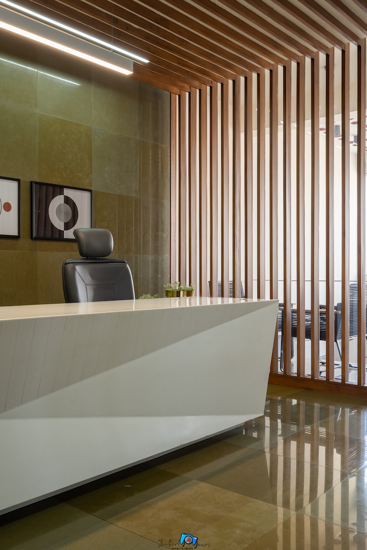 First floor director’s office resembles grandeur. The kota flooring is flowing through the back wall, providing a continuous frame. The table has exploration of parametric design with white Korean material giving aesthetic appeal. The highlighting design theory is where the waiting lounge and storage unit is treated as single element. The integrated metal section flows as base of lounge to top of storage unit. The same concept is seen over wall mount metal section flowing as base for wall storage.
