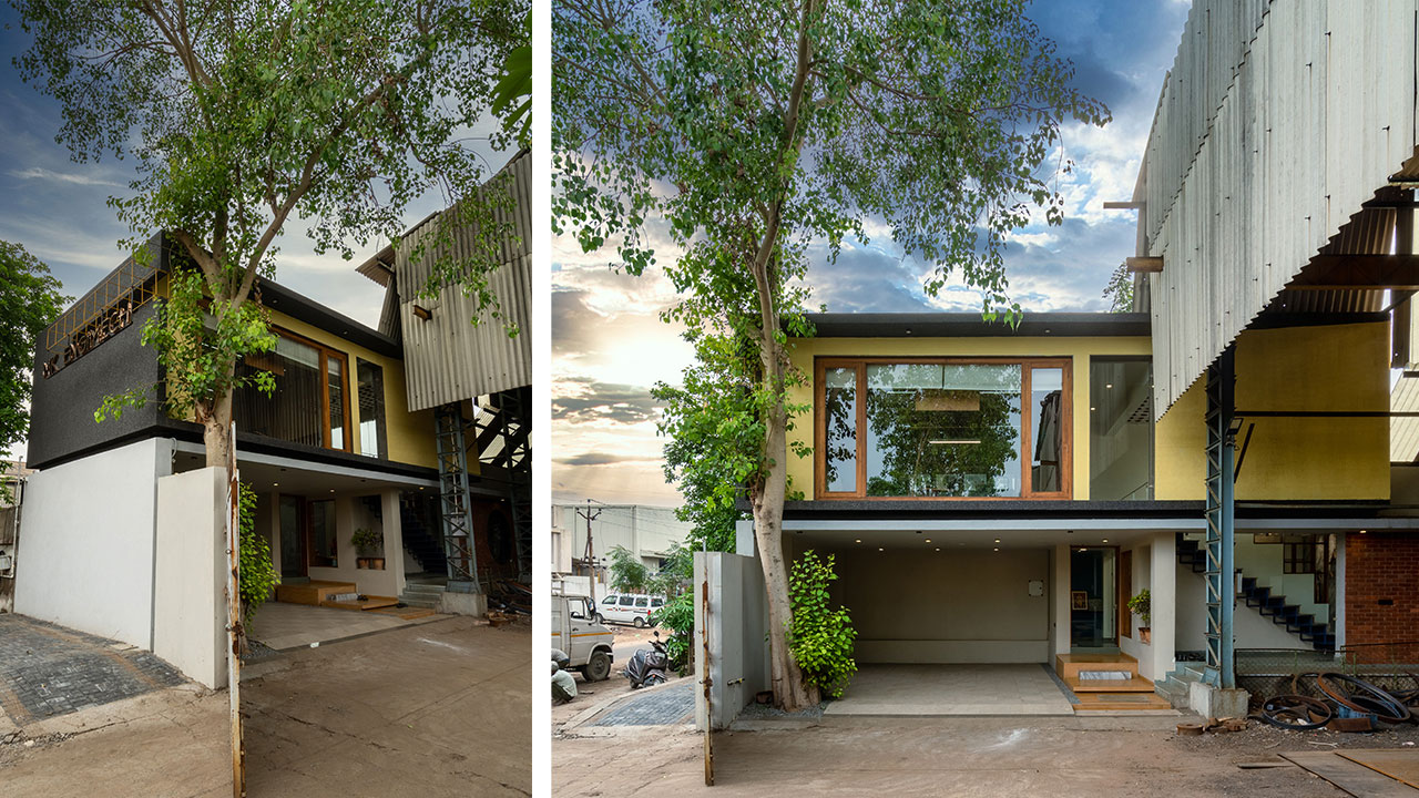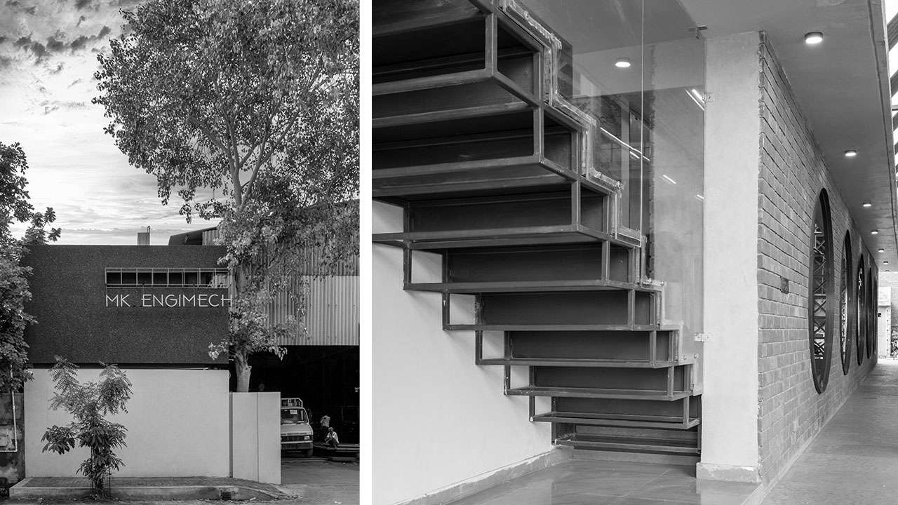 Inspired from the context and industrial location, interior is focused towards metal sections and steel frames. The entrance is provided with glass door holding steel frame and allowing full visibility.