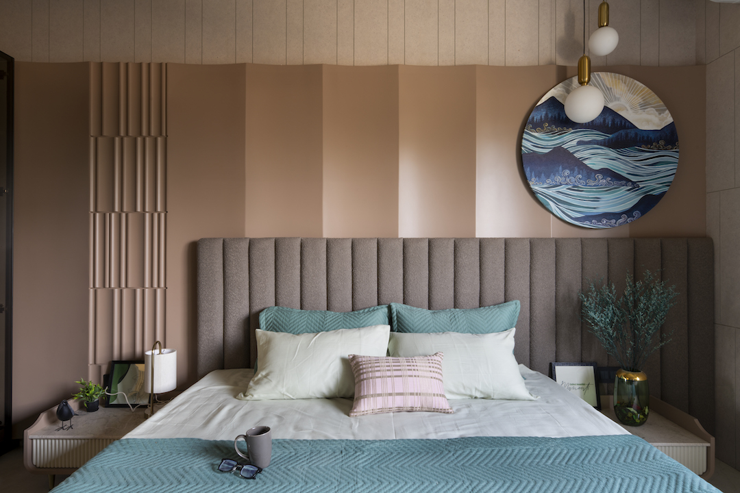 Flowing from the common areas into the ground floor bedroom, the continuity in materials and tones becomes apparent. A warm beige palette is enriched with textural wall panels and a bed backdrop in a distinctive fluting style. PU and fluted side tables add a touch of glamour, while smoke glass shutters and curated lighting elements—including a corner pendant—complete the luxurious feel.