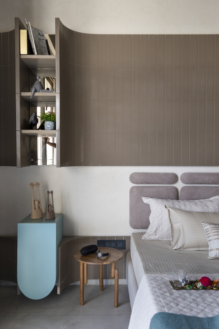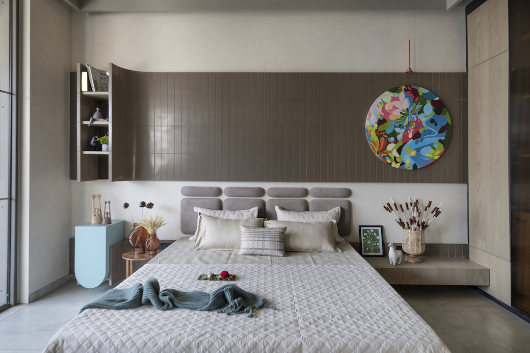 In contrast, the master bedroom exudes calm sophistication. Taupe and beige form the base of the palette, layered with geometric forms and softly illuminated surfaces. A grooved wall panel transitions into a mirrored surface, adding depth and light. The headboard, bench, and full-height fluted wardrobe in smoked glass are elegantly balanced by a suspended sea green metal shelf and a U-shaped mirror. The sea green TV unit subtly references the palette from the drawing room, reinforcing continuity.