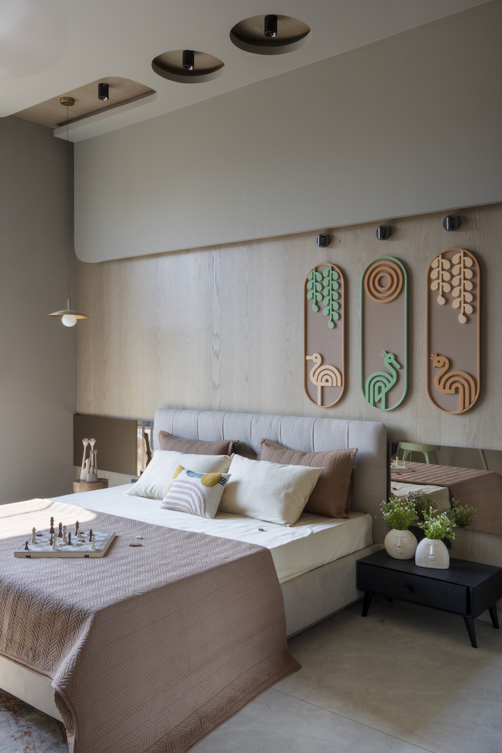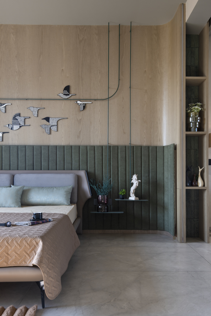 Finally, the second-floor master suite presents a luxurious retreat, offering both a sitting and resting area with an attached bath. A sculpted wooden panel curves behind the bed, broken beautifully by slits of green tiles and vertical rods with artwork. A green, curved wooden board continues the visual rhythm across the backdrop. The two functional zones are separated by a uniquely designed shelf, while the lounge beneath a coved POP ceiling features soft-toned furniture in beige and green. Camouflaged wardrobes blend into the paneling, and a long mirror wall with green shelving completes the visual narrative with finesse.
