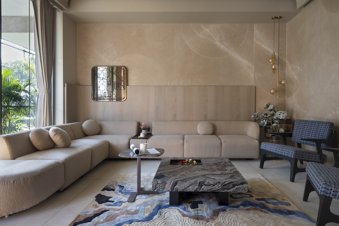 As you enter, the drawing room immediately sets the tone for the home’s refined character. The main wall is adorned with Burberry Beige Italian marble cladding, featuring elegant vertical fluting and a unique backlit glass panel that adds a warm, ambient glow. This sophisticated backdrop frames a subtle, beige-toned sofa that harmonizes perfectly with the marble’s palette. Adding contrast and depth, the carpet, accent chair, and TV console are rendered in rich blue tones, bringing drama to the space.