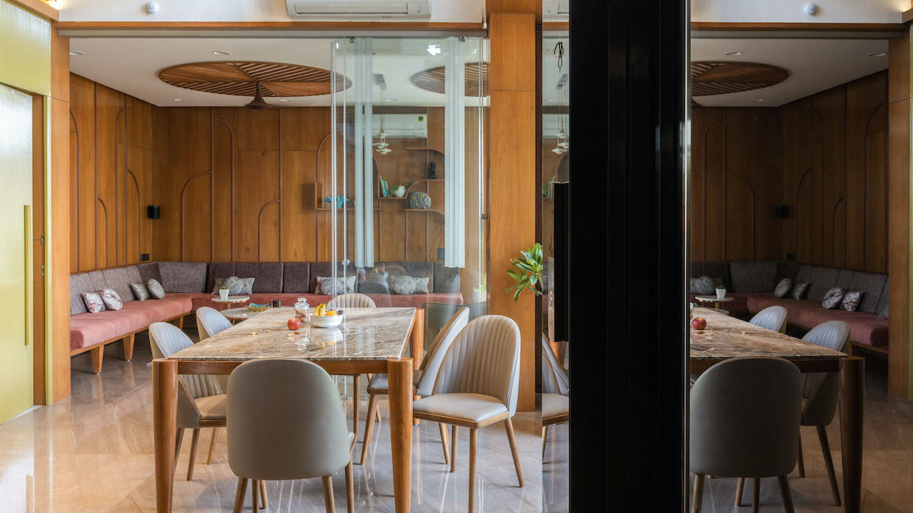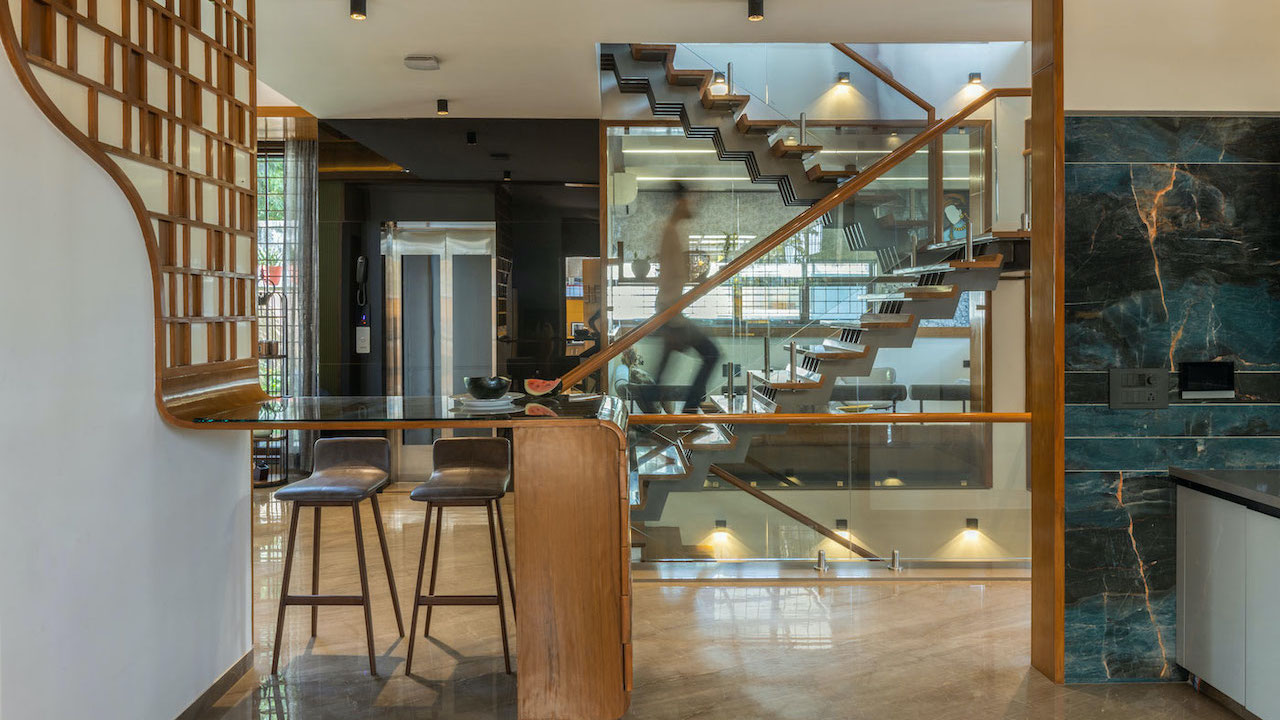 The kitchen was positioned near the entrance to allow glimpses of who's entering the vestibule through small openings that merge with the triangular pattern. The dining area has a huge window opening that overlooks the garden, and a double-height slab that's further enhanced with a bridge connecting to a bedroom. The living room is connected to the dining area with a cornered window glass, creating a feeling of being outdoors while still inside.