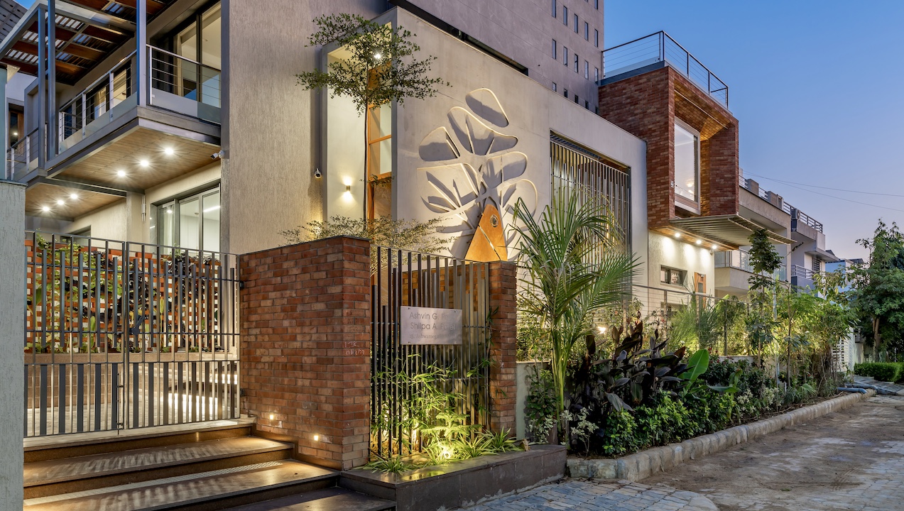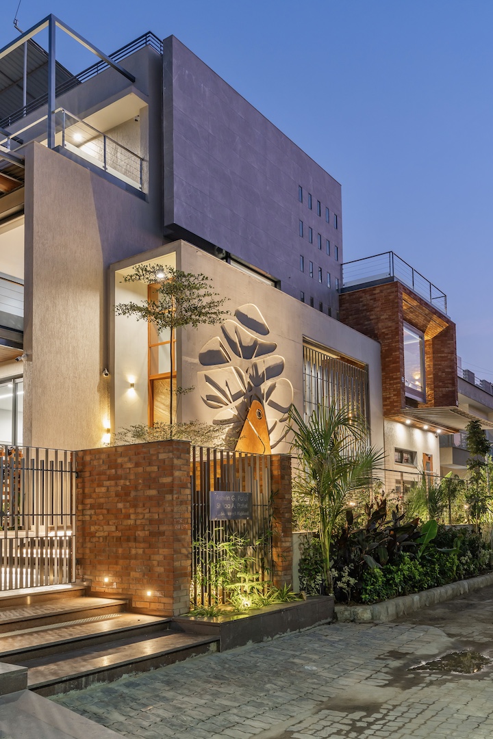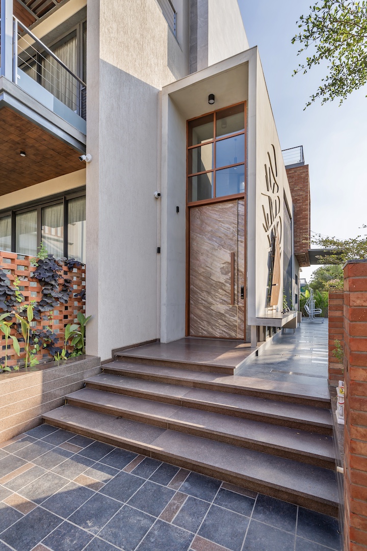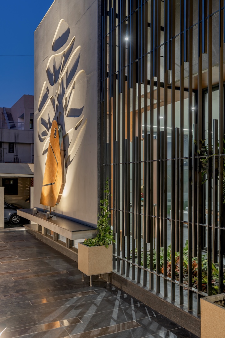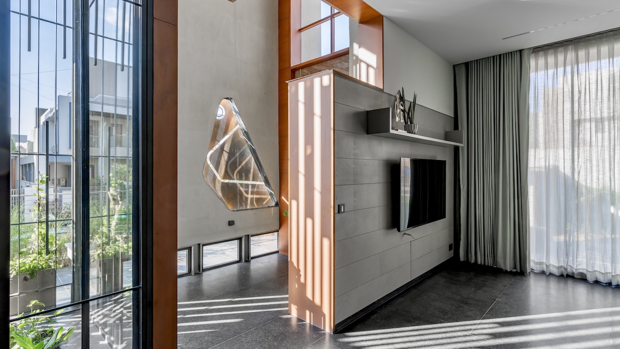 The emphasis on space optimisation, strategic placement of living areas, and consideration of natural elements such as sunlight and wind direction were foundational to the project. Located within a bustling society, the bungalow stands out for its simplicity and elegance, achieved through a careful interplay of materials, notably showcased by the prominent concrete wall casted with shape like tree, adorned with a metal sparrow mural. Architectural elements like the zarokha in brick cladding serve as timeless accents, breaking the monotony of the blank masses.