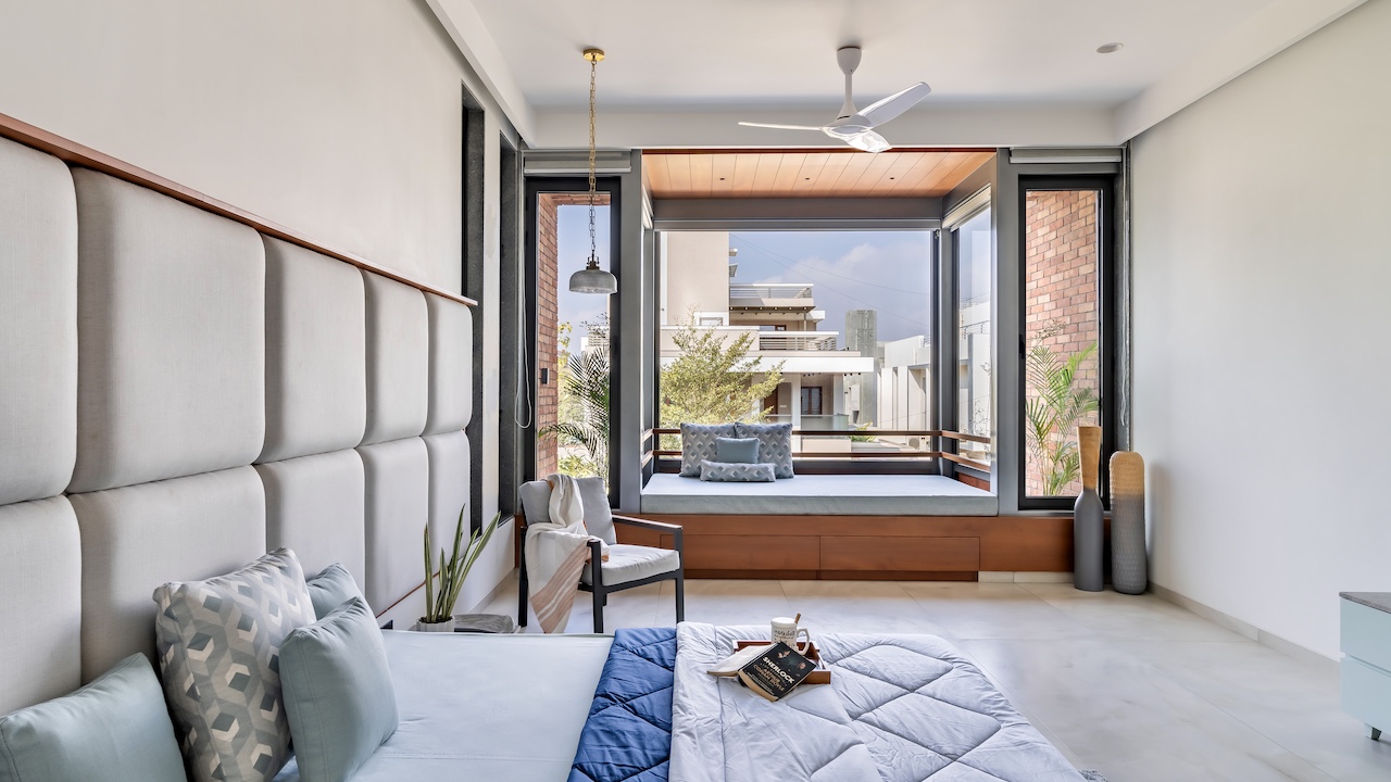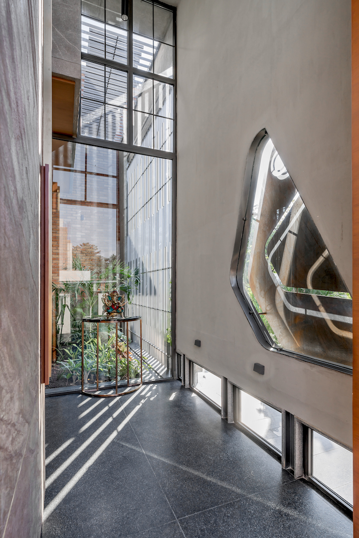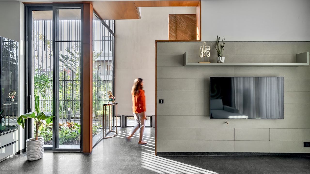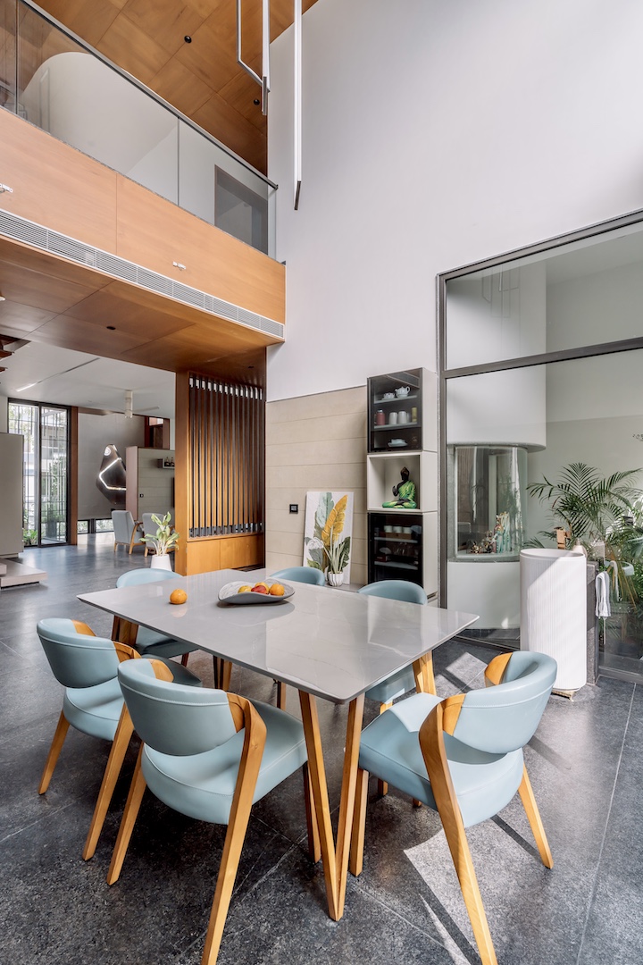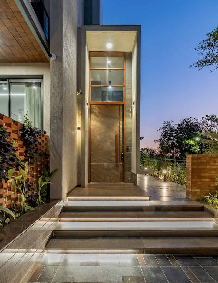 The orientation of the entire house towards the north not only maximises natural light in living areas but also shields against harsh sunlight, allowing seamless views of the garden. Services and courtyards positioned towards the south and west introduce porosity, inviting gentle evening sun rays to filter through courtyard jalis, creating dynamic experiences based on the time of day. Additionally, this layout fosters natural ventilation, contributing to a pleasant atmosphere indoors. The incorporation of a courtyard adjacent to the temple and dining area further integrates nature into the living space, ensuring a continuous connection to the landscape and varied play of sunlight throughout the day.